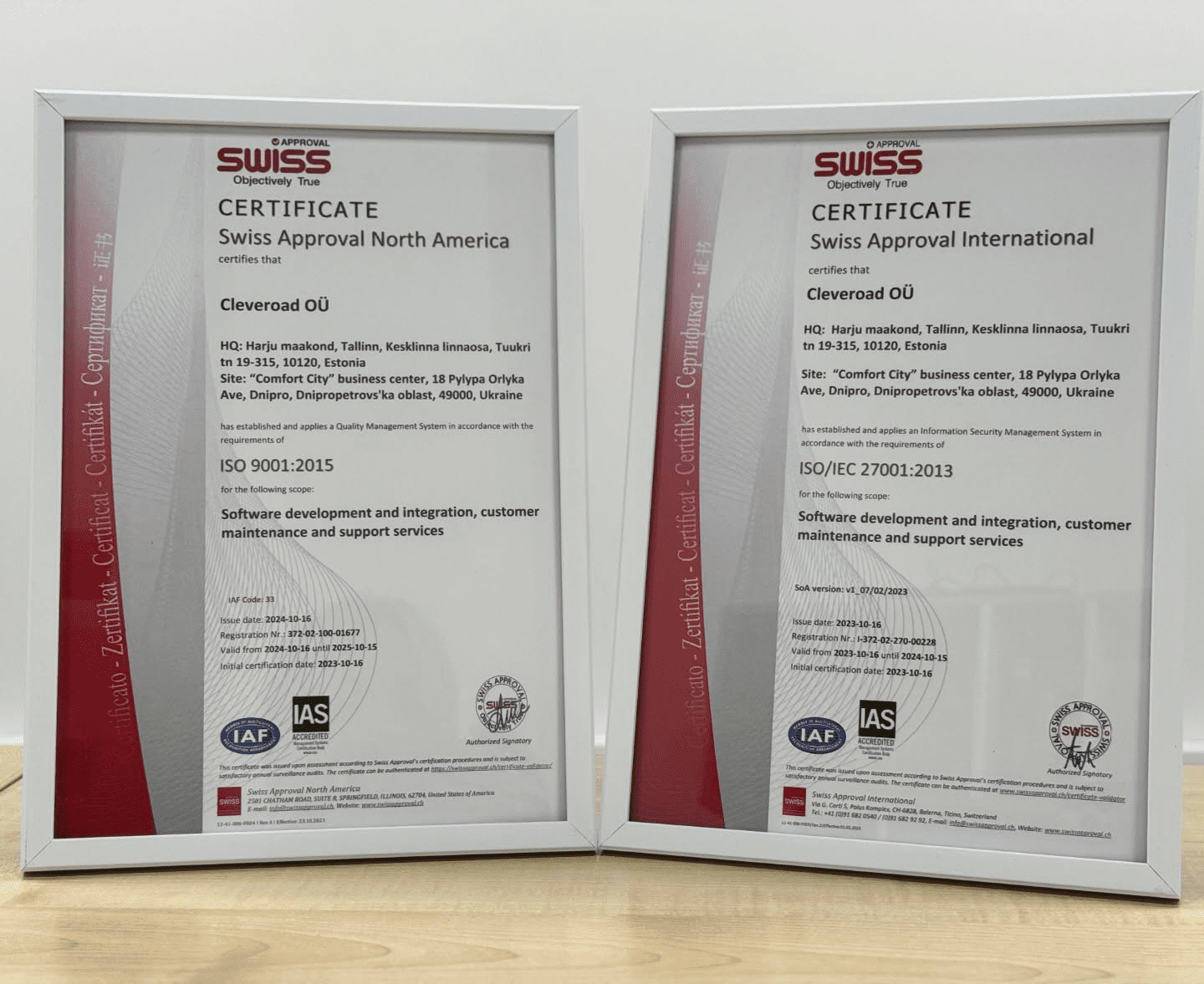 З першого дня створення “Cleveroad” приділяє особливу увагу якості продуктів і безпеці інформації. Завдяки постійній роботі над вдосконаленням процесів компанія успішно підтвердила свою відповідність міжнародним стандартам ISO/IEC 27001:2013 та ISO/IEC 9001:2015.